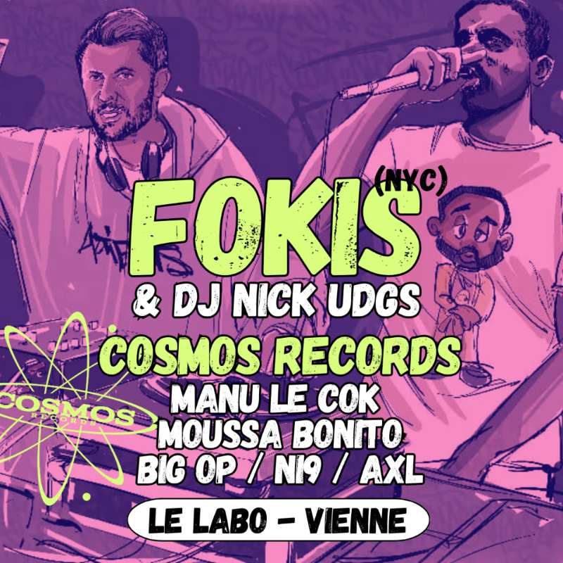 GROSSE AMBIANCE HIP HOP EN PERSPECTIVE AVEC L’INCONTOURNABLE RAPPEUR NEW YORK FOKIS, ACCOMPAGNÉ DE NICK UDGS AUX PLATINES, ET LA BANDE DU LABEL COSMOS RECORDS QUI SE CHARGERONT D’ASSURER LE SHOW.